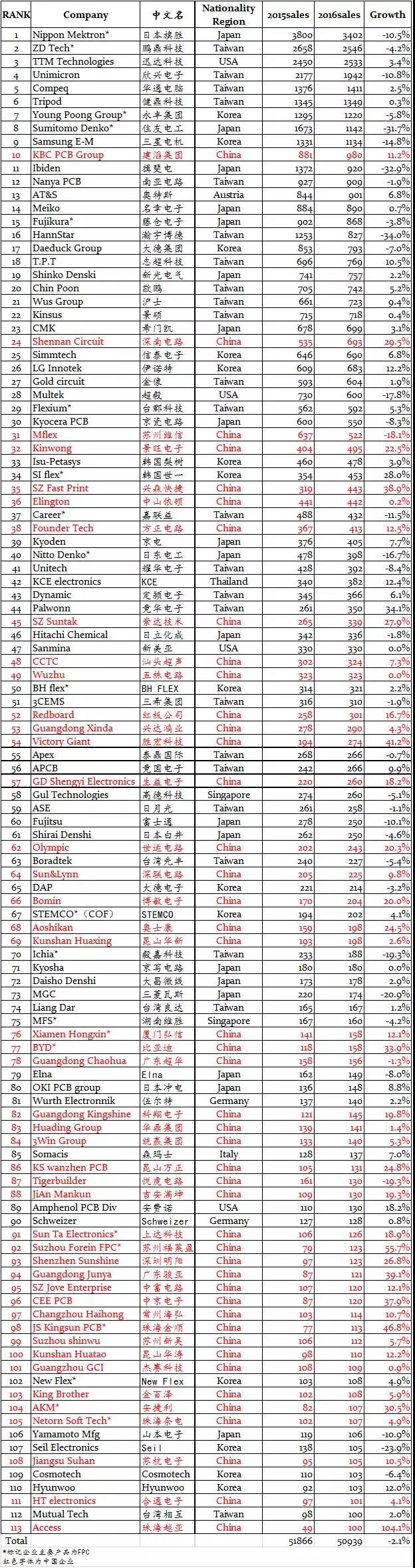 線路板廠公布2016年全球PCB制造企業(yè)百強排行榜!
