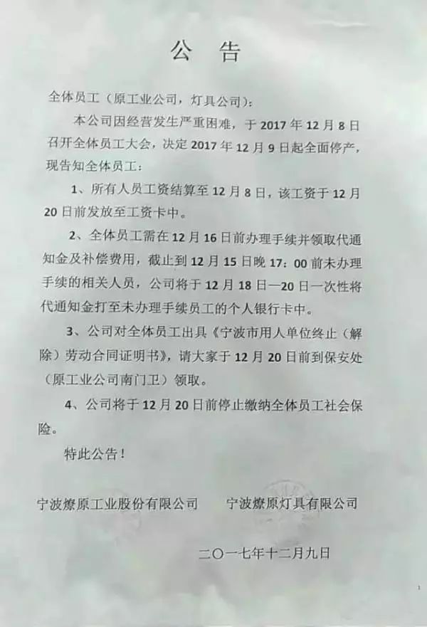 據(jù)公告顯示,公司因經(jīng)營發(fā)生嚴重困難,于2017年12月8日召開全體員工大會,決定2017年12月9日起全面停產(chǎn)。所有人員工資結(jié)算至12月8日,并對全體員工發(fā)放《寧波市用人單位終止(解除)勞動合同證明書》。