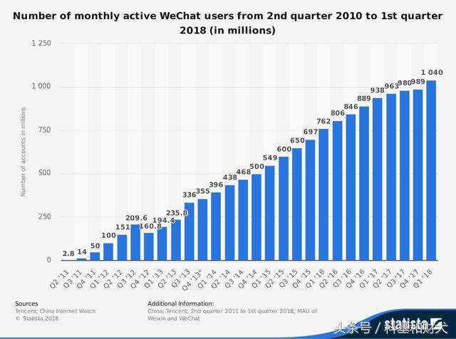 從當前的用戶數量來看,微信以10億月活成為全球應用第一梯隊。