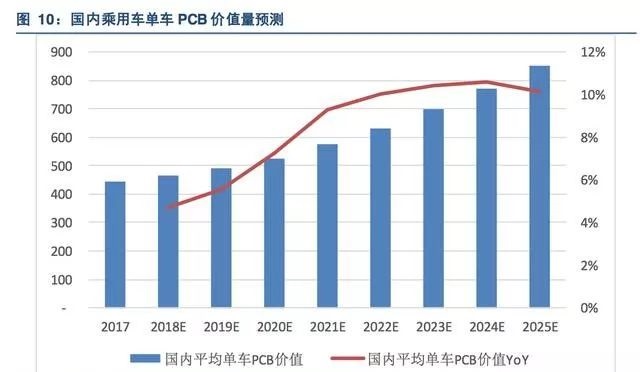 較高的要求使得汽車PCB對(duì)生產(chǎn)良率的要求高于一般PCB。同時(shí)汽車PCB對(duì)鉆孔、蝕刻等工藝環(huán)節(jié)的要求都較高,加上設(shè)計(jì)、試驗(yàn)驗(yàn)證的附加值,產(chǎn)品單價(jià)高于一般PCB。由此預(yù)測(cè)汽車PCB的單車平均價(jià)值將從2018年的464元上升到2025年的850元,期間CAGR為9%。