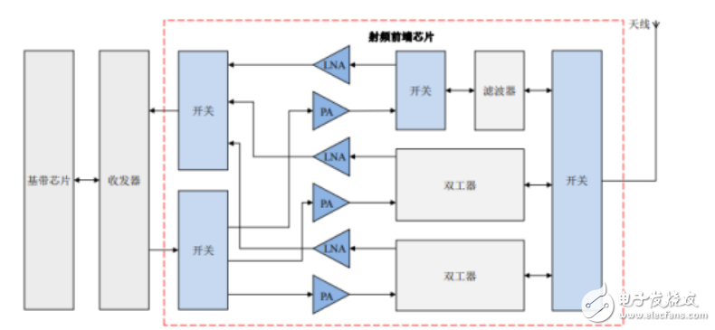 射頻芯片直接影響著手機(jī)的信號收發(fā)。如果沒有它,手機(jī)根本無法連接到移動(dòng)網(wǎng)絡(luò)。在智能手機(jī)中,它是射頻收發(fā)器和天線之間的一系列組件,主要包括功率放大器(PA)、濾波器、天線開關(guān)、雙工器和低噪聲放大器等。