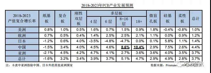 根據Prismark的預測,在未來的一段時間內,多層板仍將保持重要的市場地位,為PCB產業的整體發展提供重要支持。從產品結構來看,中國PCB市場中,公司優勢產品8-16層多層板、18層以上超高層板2018-2023年復合增長率預計將分別達到8.6%、10.4%。Prismark詳細預測數據參見下表: