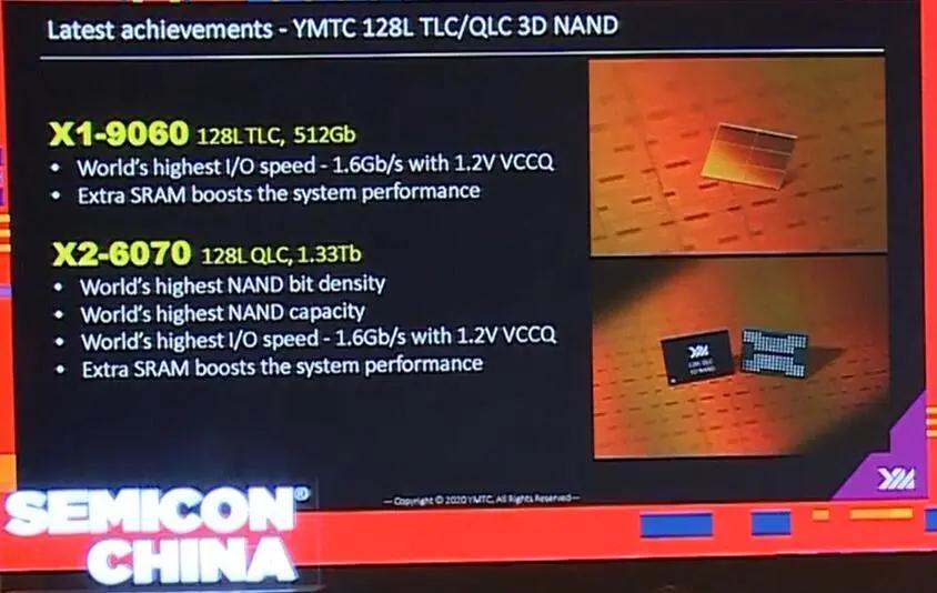 2020年4月,長江存儲宣布推出128層QLC 3D NAND 閃存(型號:X2-6070),以及128層512Gb TLC(3 bit/cell)閃存(型號:X2-9060)。兩款產品均采用長存自主研發的Xtacking® 2.0版本,其中,X2-6070是業內首款128層QLC規格的3D NAND閃存,擁有業內已知型號產品中最高單位面積存儲密度,最高I/O傳輸速度和最高單顆NAND閃存芯片容量。
