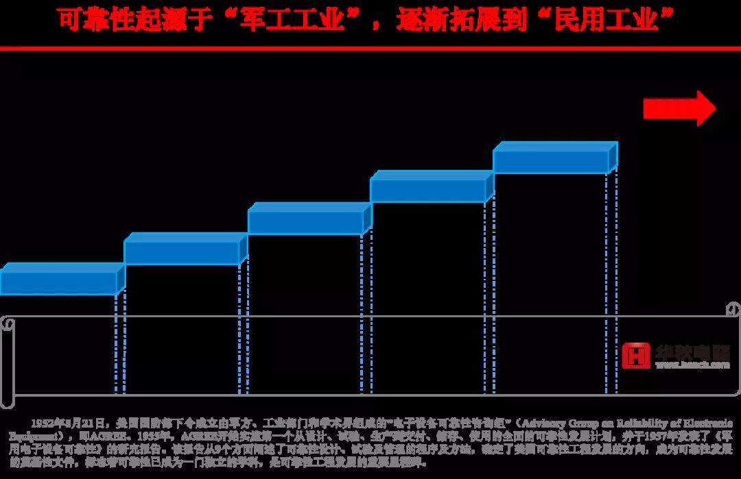 1949年,美國無線電工程師學會成立了第一個可靠性專業學術組織——可靠性技術組。1950年12月,美國成立了“電子設備可靠性專門委員會”,軍方、武器制造公司及學術界開始介入可靠性研究,到1952年3月便提出了具有深遠影響的建議;研究成果首先應用于航天、軍事、電子等軍工工業,隨后逐漸擴展到民用工業。