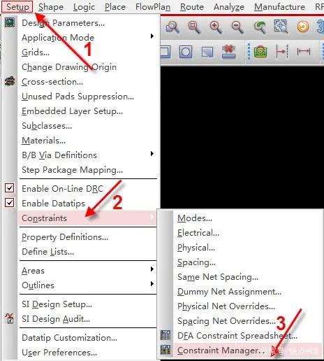 - 第一步,打開規則管理器,執行菜單命令Setup-Constraints,在下拉菜單中選擇Constraint Manager,如圖5-90所示,進入到規則管理器中;