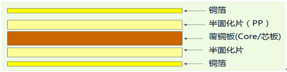PCB構成圖如下。半固化片和覆銅板就是我們常說的PP和芯板。其中的介質就是環氧樹脂和玻璃纖維布混合成的。(剛性印制電路板)