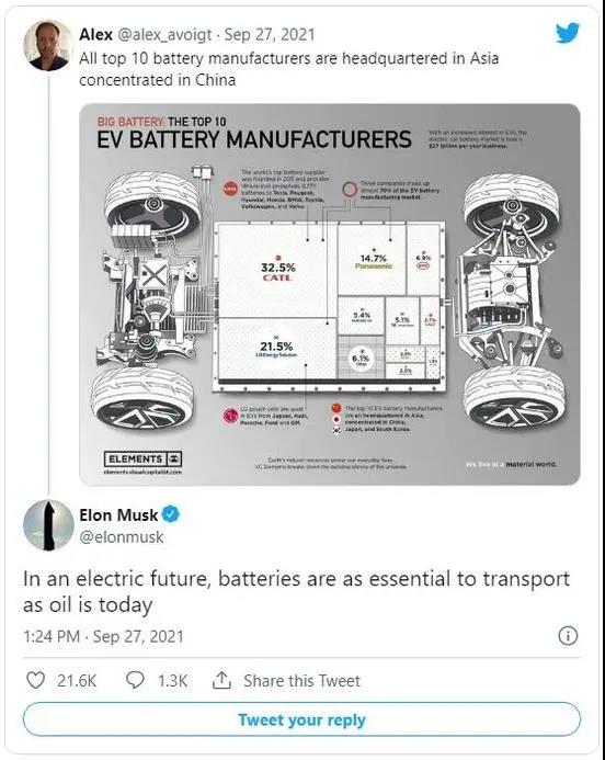馬斯克回復并轉發了這篇推文,他表示:“在電動化的未來,電動汽車電池在交通領域中的重要作用,就像今天的石油一樣。”