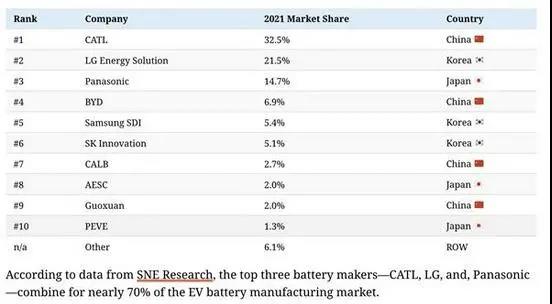 韓國 LG 能源解決方案公司和日本松下公司排在第二和第三位,分別占21.5%和14.7%的市場份額。比亞迪排名第四,占據6.9%份額。中航鋰電占據2.7%份額,排名第七;國軒高科為2.0%,排名第九。前十席位中,中國廠商占據四席,合計份額同樣為世界第一。