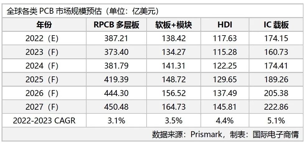 作為電子產(chǎn)品之母,PCB產(chǎn)業(yè)同樣因終端市況不佳而出現(xiàn)市場規(guī)模的小幅度衰退。所幸的是,2024年起PCB市場規(guī)模將恢復逐年成長,其中IC載板作為集成電路先進封裝的關(guān)鍵基材,今后五年的成長率將領(lǐng)銜上升。
