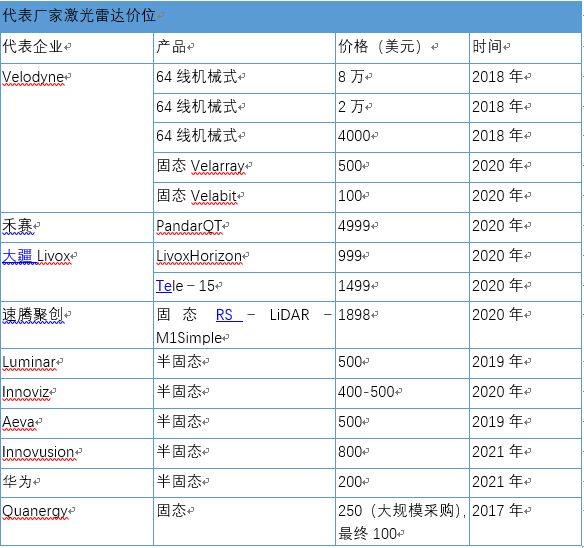 從價格上來講,汽車軟硬結(jié)合板廠深深了解到,激光雷達比毫米波雷達貴很多,不單單是從本身傳感器的成本來講,激光雷達的數(shù)據(jù)處理單元等配套的相關也很貴。雖然近幾年來,各激光廠家不斷在降低其成本,激光雷達的價格已經(jīng)從10萬美元的區(qū)間,下降到了100美元的區(qū)間,但這100美元的產(chǎn)品并非車規(guī)量產(chǎn)雷達,100美元的激光雷達一般是用于短距盲區(qū)探測,真正車規(guī)級激光雷達都在1000美元左右。 毫米波雷達價格在100美元以內(nèi),尤其是角雷達,一般來講就100~200元人民幣,前裝前雷達向價格在300~400元人民幣。 總的來講,激光雷達數(shù)百美元的產(chǎn)品,大多是使用在L3級別自動駕駛或作為L4級別自動駕駛盲區(qū)探測雷達,數(shù)千美元的產(chǎn)品,則可以作為L4級別自動駕駛的主雷達,用于遠距離、大范圍的探測。目前車載量產(chǎn)級別激光雷達價格對比毫米波雷達價格是1000美金對50美金。