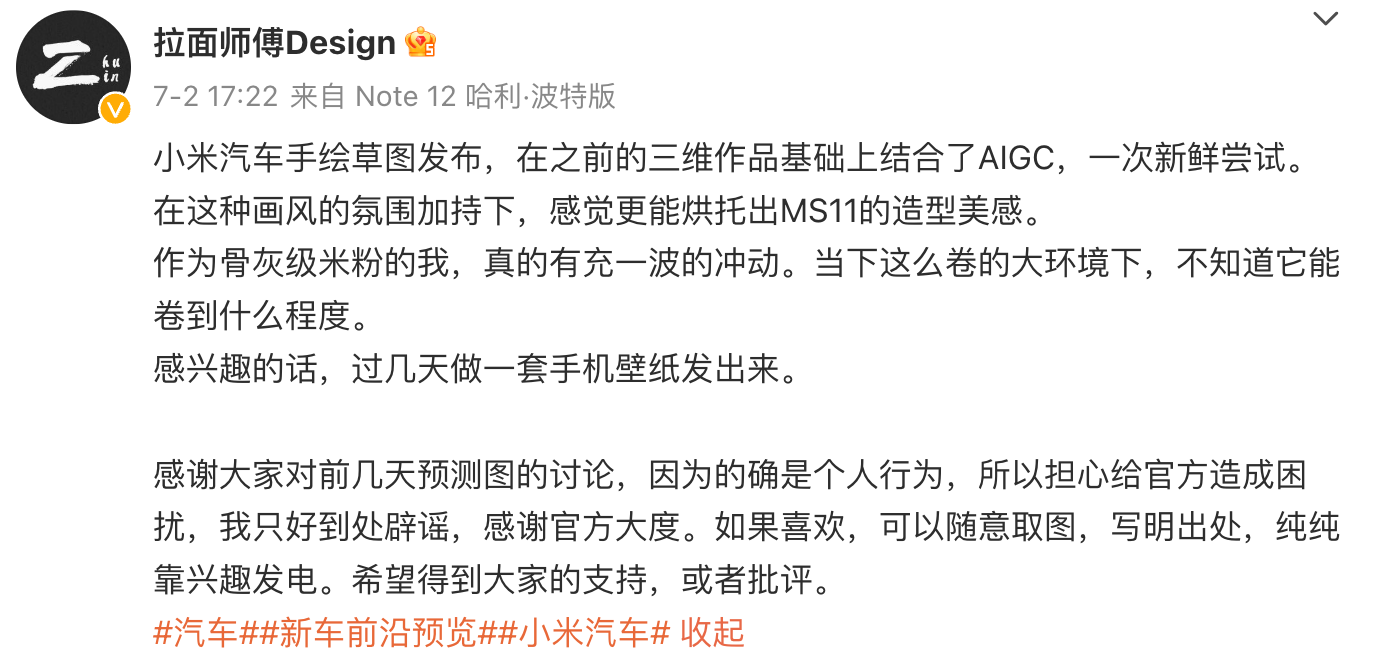 這其實(shí)是骨灰級(jí)米粉@拉面師傅Design 綜合最新的爆料、各方針對(duì)小米汽車(chē)外觀的透露信息整理設(shè)計(jì)出來(lái)的。