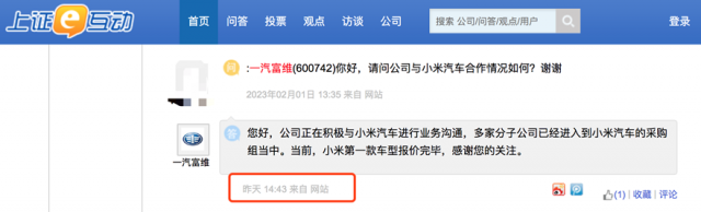 “公司正在積極與小米汽車(chē)進(jìn)行業(yè)務(wù)溝通,多家分子公司已經(jīng)進(jìn)入到小米汽車(chē)的采購(gòu)組當(dāng)中。當(dāng)前,小米第一款車(chē)型報(bào)價(jià)完畢。”