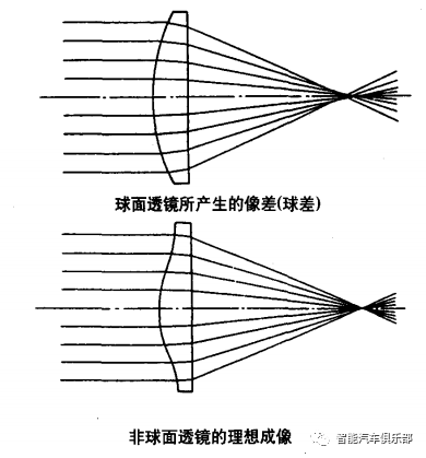 球面鏡片會導致像差問題,即從鏡片中央射入的光線與鏡片邊緣射入的光線的焦點不一致,進而造成成像模糊的問題。球面鏡片需要多枚鏡片組合來減小像差。
