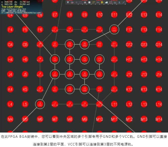 只是作為一個示例,看看下面所示的BGA。這種特殊的BGA是典型的高速接口控制器,需要在多電壓下提供大量電流,因此許多球將連接到電源和接地。諸如FPGA,您可能會在其整個封裝中發現多個用于電源和接地的引腳。將單層專用于電源,便可將平面分解成軌道,以便在必要時在高電流下使用多電壓。這樣就無需在不同的電壓下重疊這些電源軌,從而防止出現額外的EMI問題。