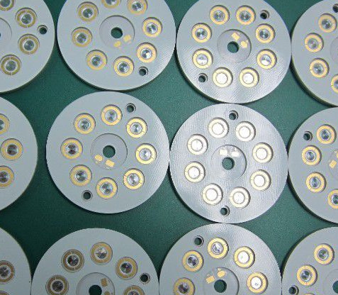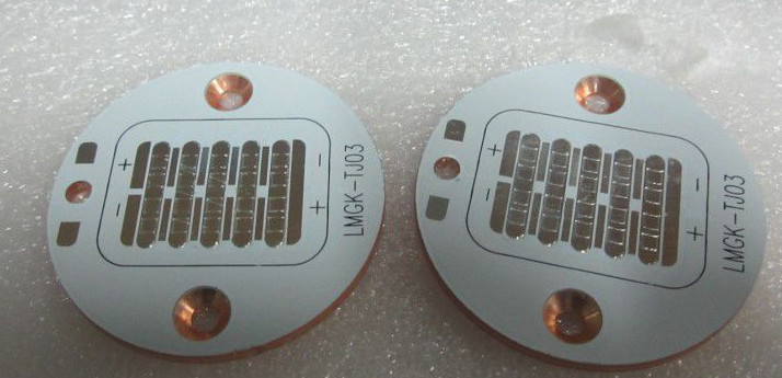 分別是電路層(銅箔)、絕緣層和金屬基層。常見于LED照明產品。有正反兩面,白色的一面是焊接LED引腳的,另一面呈現鋁本色,一般會涂抹導熱凝漿后與導熱部分接觸。目前還有陶瓷基板等等。如圖: