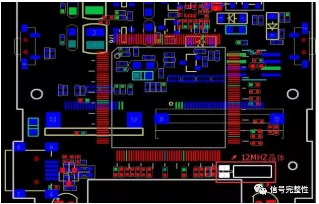 該產(chǎn)品只有一塊PCB,其上有一個(gè)12MHz的晶體。其中超標(biāo)頻點(diǎn)恰好都是12MHz的倍頻,而分析該機(jī)器容易EMI輻射超標(biāo)的屏和攝像頭,發(fā)現(xiàn)LCD-CLK是33MHz,而攝像頭MCLK是24MHz;通過排除發(fā)現(xiàn)去掉攝像頭后,超標(biāo)點(diǎn)依然存在,而通過屏蔽12MHz晶體,超標(biāo)點(diǎn)有降低,由此判斷144MHz超標(biāo)點(diǎn)與晶體有關(guān),PCB布局如下: