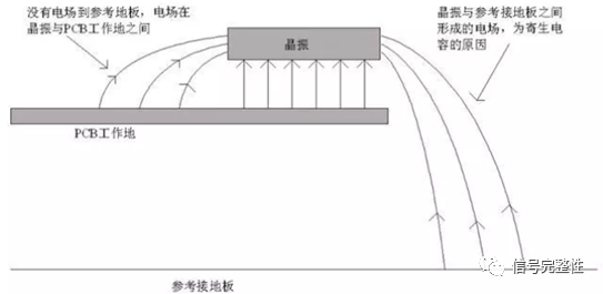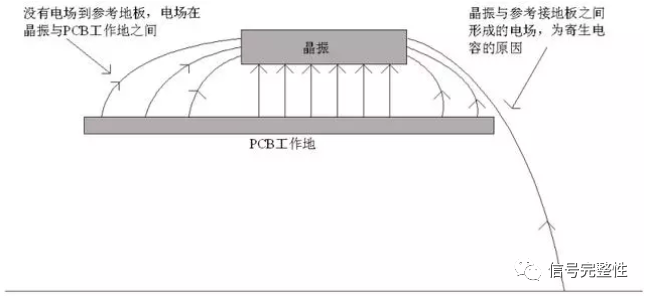 圖3:PCB邊緣的晶振與參考接地板之間的電場(chǎng)分布示意圖