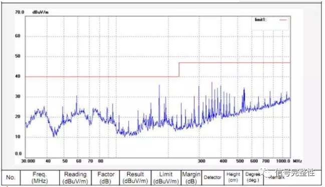 將晶振內(nèi)移,使其離PCB邊緣至少1cm以上的距離,并在PCB表層離晶振1cm的范圍內(nèi)敷銅,同時(shí)把表層的銅通過過孔與PCB地平面相連。經(jīng)過修改后的測(cè)試結(jié)果頻譜圖如下,從圖可以看出,輻射發(fā)射有了明顯改善。