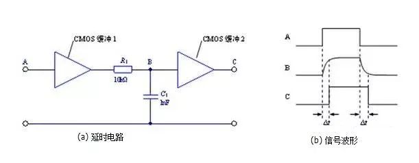 當變大到一定程度時,緩沖2翻轉,在輸出端得到了一個延遲的由低向高的跳變。