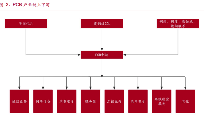 上游包括覆銅板、半固化片、銅箔、銅球、金鹽、干膜、油墨等原材料;