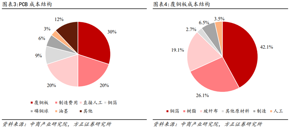 產業結構:PCB是位于制造業產業鏈中游,而覆銅板(CCL)則是上游的原材料,是 PCB 制造中最常見的材料, PCB 成本主要由覆銅板等直接原材料構成,占比近 50%,其中覆銅板占據 30%,覆銅板成本主要由銅箔、 樹脂和玻纖布構成,占比分別為 42.1%、26.1%、19.1%,合計 87.3%。