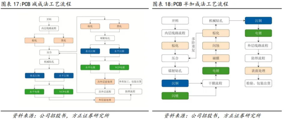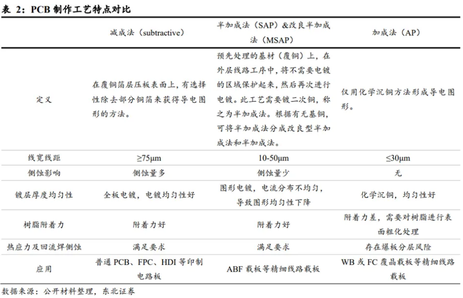電路板主要的制作工藝分為三類,分別是減成法、半加成法、加成法,適用于不同類型的產(chǎn)品。同時(shí)在同一款基板的制作中也可依據(jù)需求使用上述三類工藝的混合工藝。目前PCB生產(chǎn)工藝中減成法和半加成法為主流: