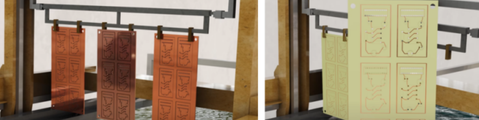 接下來的步驟涉及將覆銅板浸入特定化學溶劑中,這樣未被抗腐蝕材料保護的銅便會被溶解去除。