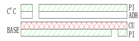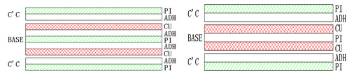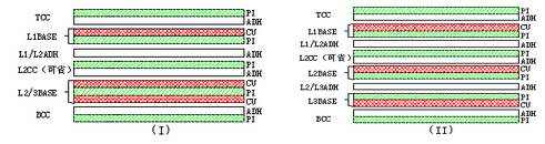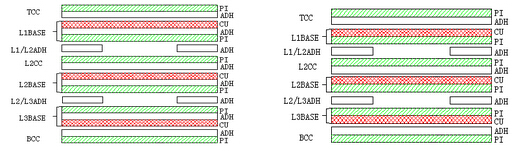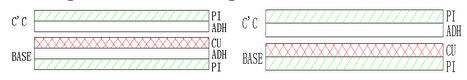 ⑵上下保護(hù)膜開(kāi)口不在同一區(qū)域時(shí)的做法:CU+CC(無(wú)膠基材+保護(hù)膜)。此時(shí)CC的膠只能用環(huán)氧膠,不可用壓克力膠;是走蝕刻PI線。