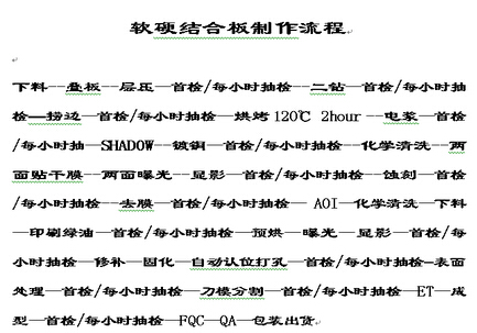基本流程:下料→化學(xué)清洗→貼干膜→曝光→顯影→首檢/每小時(shí)抽檢→蝕刻→首檢/每小時(shí)抽檢→去膜→首檢/每小時(shí)抽檢→AOI→化學(xué)清洗→烘干120℃15Min→下料→貼上保護(hù)膜→層壓→首檢/每小時(shí)抽檢→下料→貼補(bǔ)強(qiáng)→層壓→首檢/每小時(shí)抽檢→自動(dòng)認(rèn)位打孔→首檢/每小時(shí)抽檢→化學(xué)清洗→表面處理→首檢/每小時(shí)抽檢→刀模分割→首檢/每小時(shí)抽檢→ET→鋼模沖切外形→首檢/每小時(shí)抽檢→FQC→QA→包裝出貨。