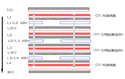 制作方式:首先內(nèi)層線路L2/L3、L4/L5走雙面板流程,三明治做法;然后通過(guò)疊板孔進(jìn)行總疊板(需打鉚釘),最后做L1和L6的線路。