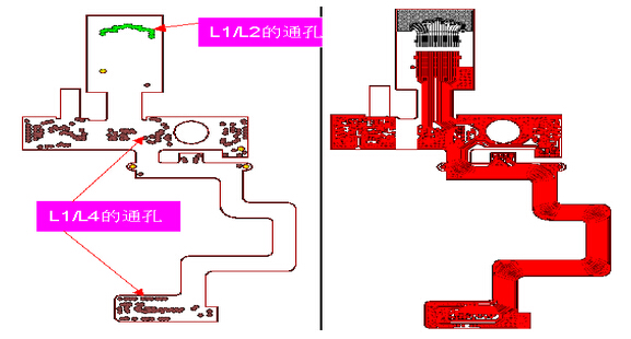 ●此類(lèi)板子的制作難點(diǎn):有兩次鉆孔,L1層線路需要對(duì)兩次鉆出的孔對(duì)位,同時(shí)不允許出現(xiàn)孔破。如下圖: