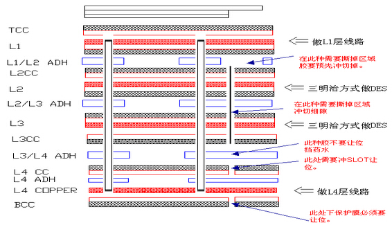 制作方式:首先內(nèi)層線路L2/L3、L4/L5走雙面板流程,其中L5用輔助底片;然后總疊板(需打鉚釘),做L1和L5的線路。