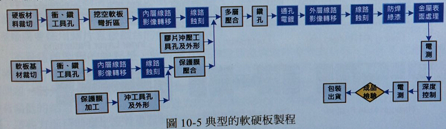 概略的推估,軟硬結合板制程會有一般軟板三倍以上的制程步驟,因此剔退機會與多層電路板相當。軟硬結合板結構也包括軟性基材與黏著劑,這些在溫度提升后與電路板玻璃樹脂系統比較,比較容易有異常行為出現。典型的軟硬結合板制程,如圖10-5所示。