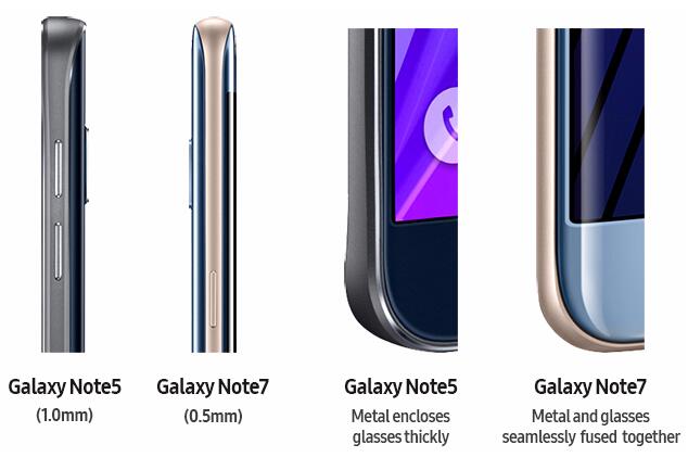 2011年推出的一代Note手機只有5.3英寸, Note 7更窄,安裝了7000系列鋁合金,這種鋁合金的硬度比Galaxy S7 Edge采用的鋁合金硬了1.3倍,正因如此,高度密封的Note 7承受了很大的壓力。加上Galaxy Note 7的密封等級達到了IP68標準,可以防水,這一標準使得手機的壓力更大。