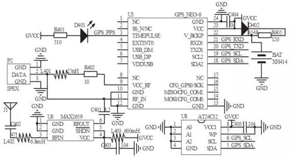 GPS模塊電路如圖3所示,該電路以U—Blox公司的GPS芯片NEO-6M為核心,在主控制器的控制下實現(xiàn)GPS的定位功能,GPS芯片與主控制器之間通過串行總線通信,電路中的EE PROM(Electrically Erasable Programmable Read-Only Memory)芯片AT24C32用來保存GPS的相關(guān)設(shè)置參數(shù)。